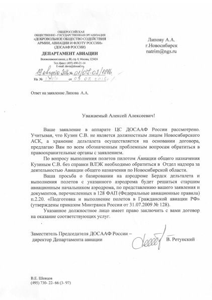 Военное следственное управление СКР по Новосибирскому гарнизону возбудило дело о нарушении правил эксплуатации воздушного транспорта (ст. 263 УК РФ) и об оказании услуг, не отвечающих требованиям безопасности (ст. 238). Обвинение предъявили Сергею Сметанину — руководителю новосибирского аэроклуба ДОСААФ, в котором курсанты занимались летной подготовкой. По версии следствия, господин Сметанин допустил к эксплуатации самолет Як-52, у которого истекло свидетельство летной годности, и кроме того, недостаточно контролировал работу авиационно-инженерной службы аэроклуба.
