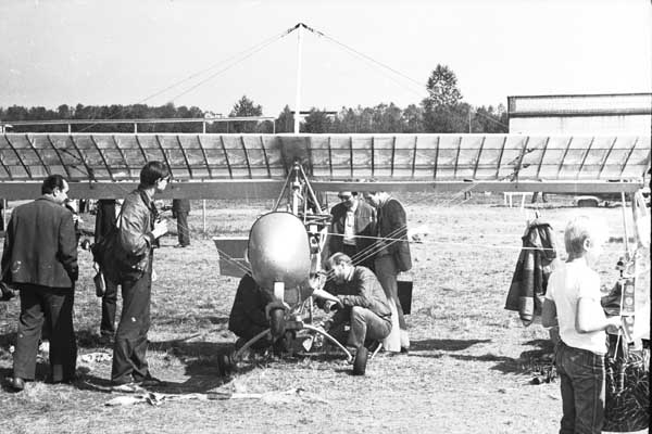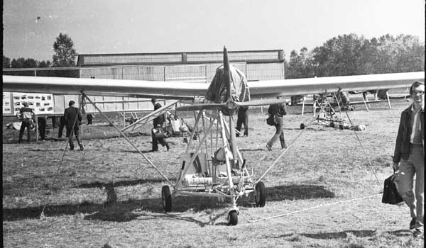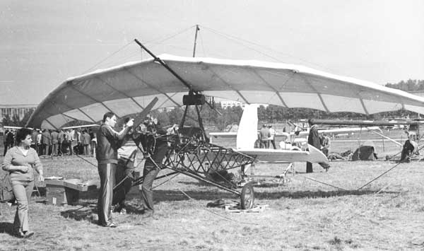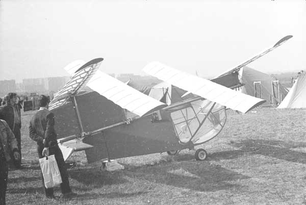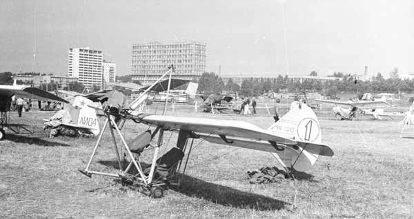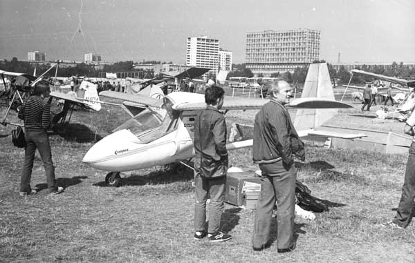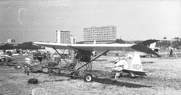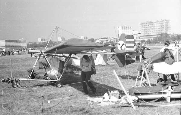 Scan83.jpg – самолёт из деревни Донино, о нём писала ТМ, колхозный водитель нашёл хорошее решение идеи простого самолёта. Машину копировали многие, на фото один из клонов (на слёте было два экземпляра). Двигатель от мотоцикла «Урал» в 38 л.с., фюзеляж сварной, крыло деревянное, летал хорошо.