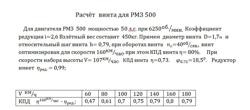 Что значить винт тяжеловат, если на максимальной расчётной скорости его КПД падает до 0,79. То есть его тяга начинает вырождаться.