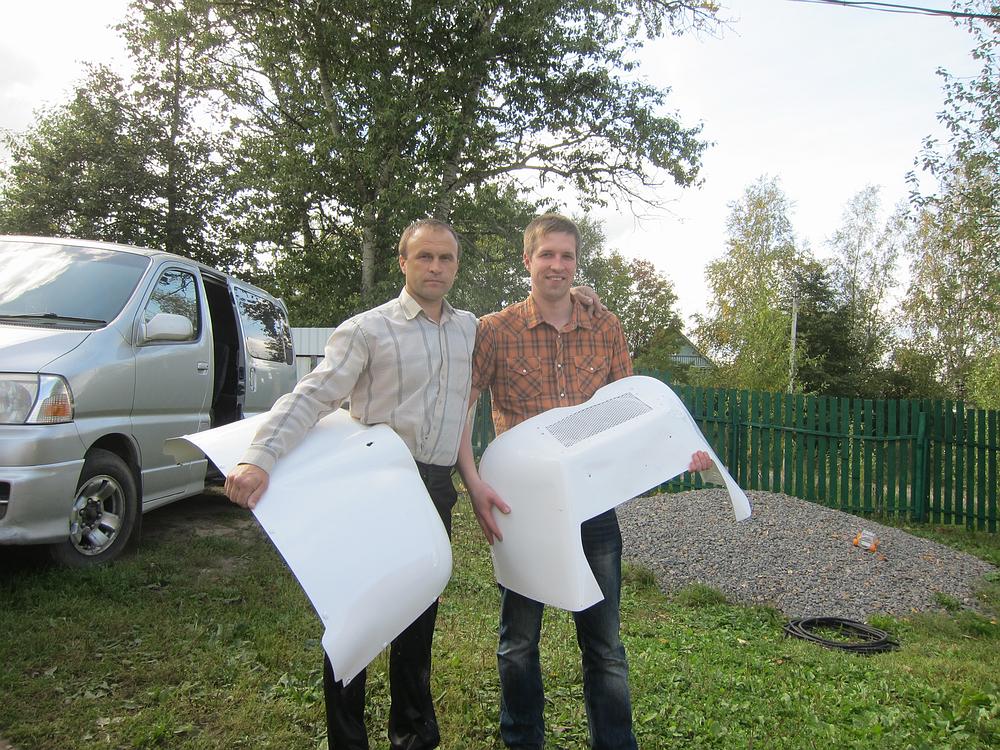 Закончил всю работу по оперению, много сделал по пластику. На фото, мы с Александром с отремонтированным и покрашенным капотом.