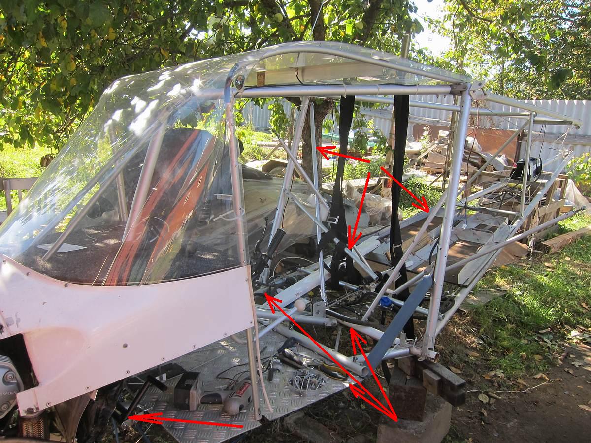 Вот фотка фюзеляжа. Стрелками обозначил основные поврежденные трубы или места уже снятых. Также сильно пострадали шасси, колеса и передняя вилка. Мое сиденье, узел крепления педалей.