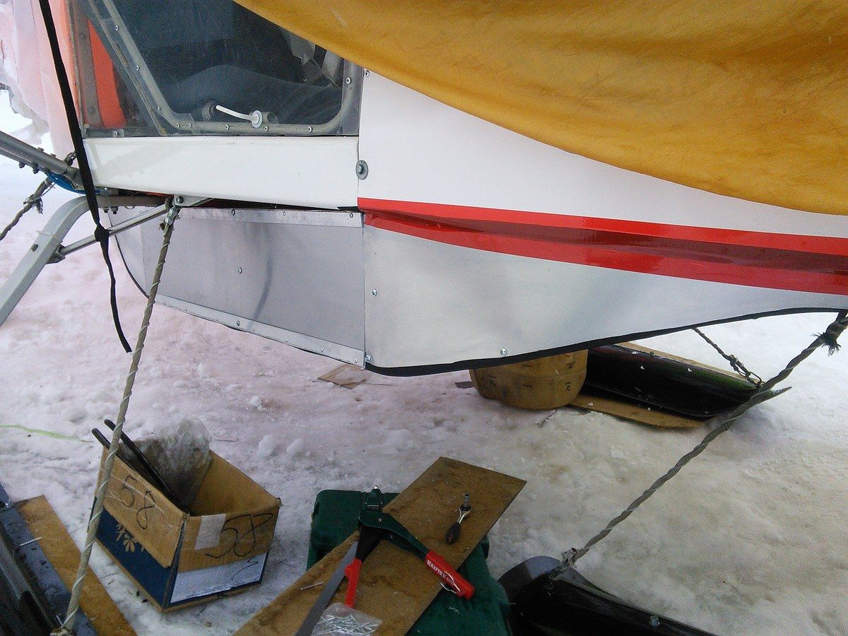 Друзья, приветствую и передаю немножко новостей от самолета Северок. Теперь у нас новый подвесной багажник и вместо одной открывающейся кверху дверки, сделал сдвижные боковинки. Работая на свежем воздухе, не тороплюсь и вначале изготавливаю шаблон и после переношу на дюраль