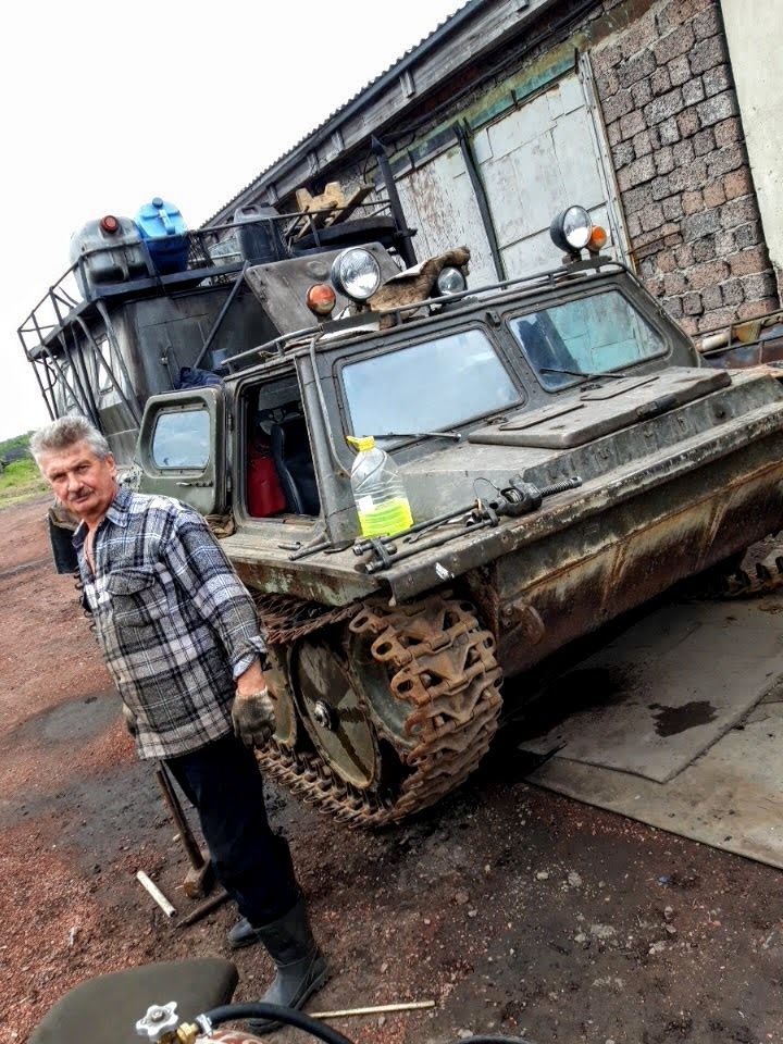 На фото Сергей готовит замену нескольким изношенным пальцам в траках вездехода.