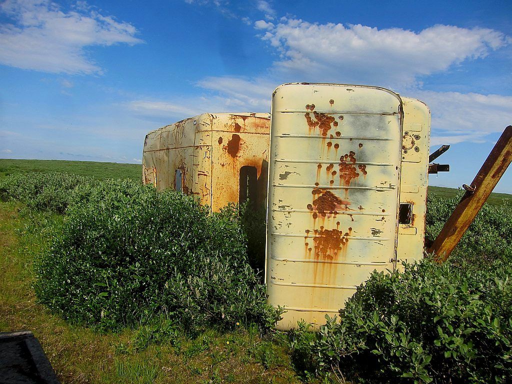 Раньше тут стояли два балка, один был сделан из фюзеляжа списанного вертолета. После был то ли пожар, то ли вандалы постарались и все превратилось в груду ржавого железа, острых дюралевых останков.