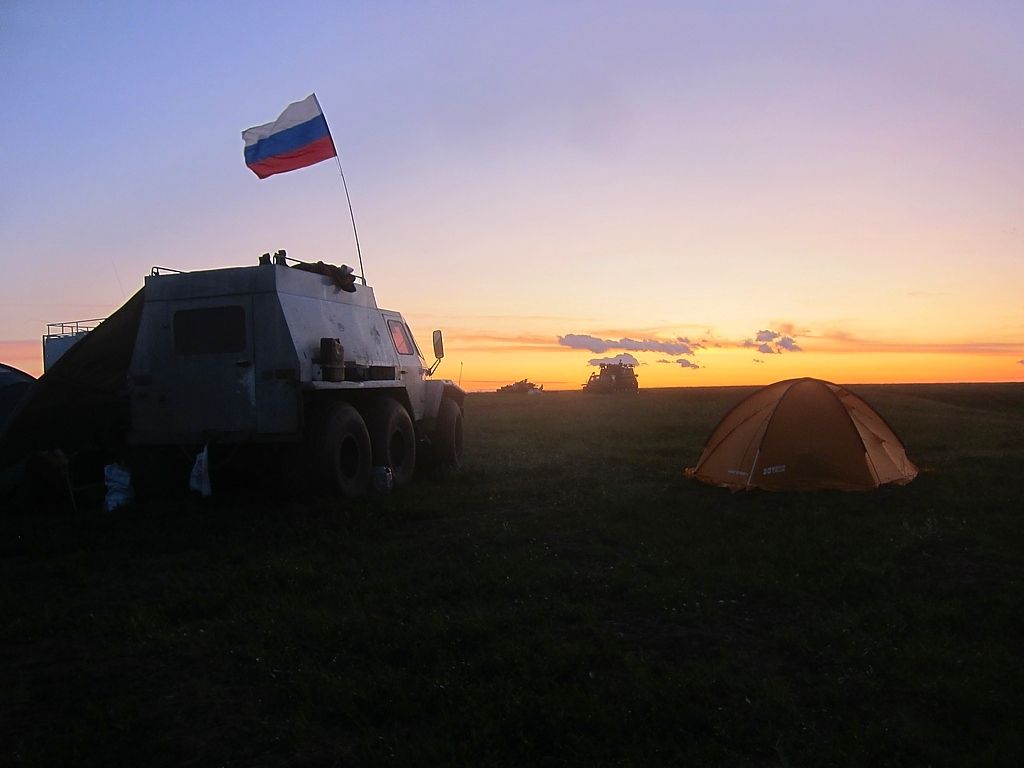 В будке вездехода сделали походный стол для нашей механической команды. Тут и домашние котлетки от супруги Сергея и сало от Самсоновича с маленькими помидорами. Я по туристической линии с рисовой кашей с мясом в жестянке выглядел бледно 🙂