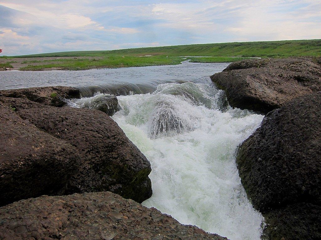 Наша техника стоит на холме, а внизу речка в виде подковы и по центру изливается каскадным водопадиком.