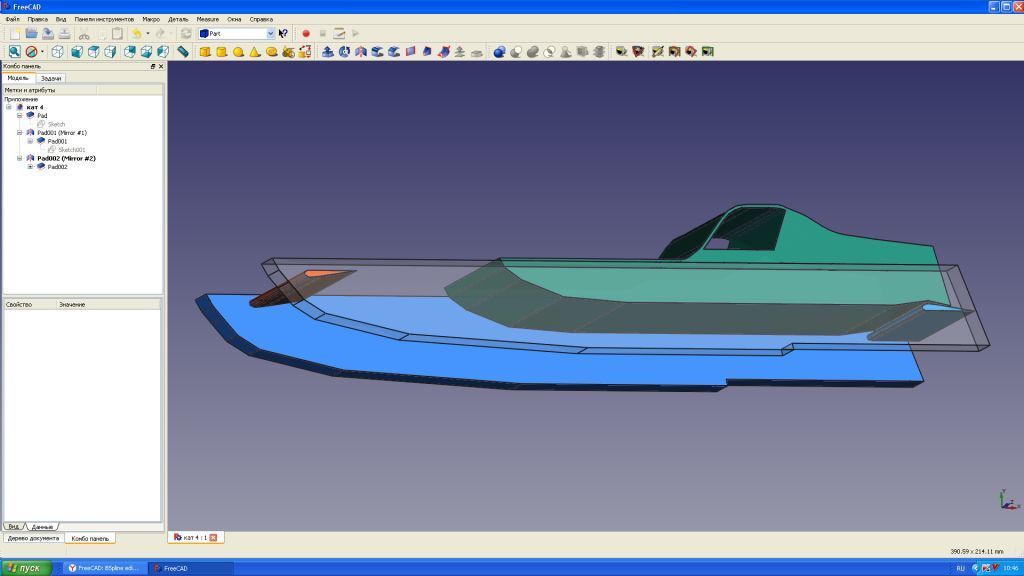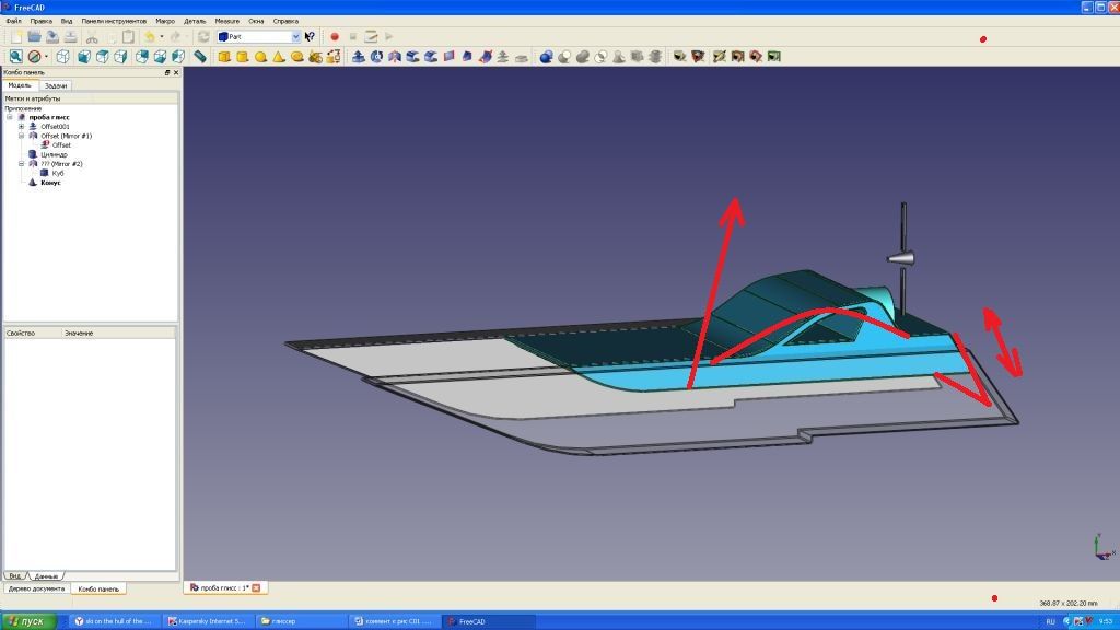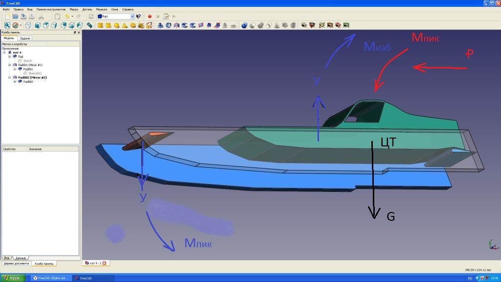 Корпус красивый. Только он рассчитан на определенную скорость. Есть большие сомнения, что такую скорость удастся достичь с воздушным винтом. А при меньших скоростях придется вносить коррективы в геометрию, чтобы компенсировать изменение обеих составляющих: и гидродинамической и аэродинамической.