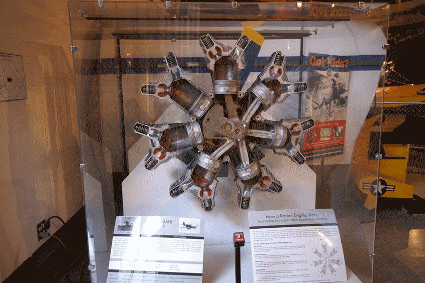 На этом станде можно нажать кнопку и увидеть как работает радиальный двигатель.