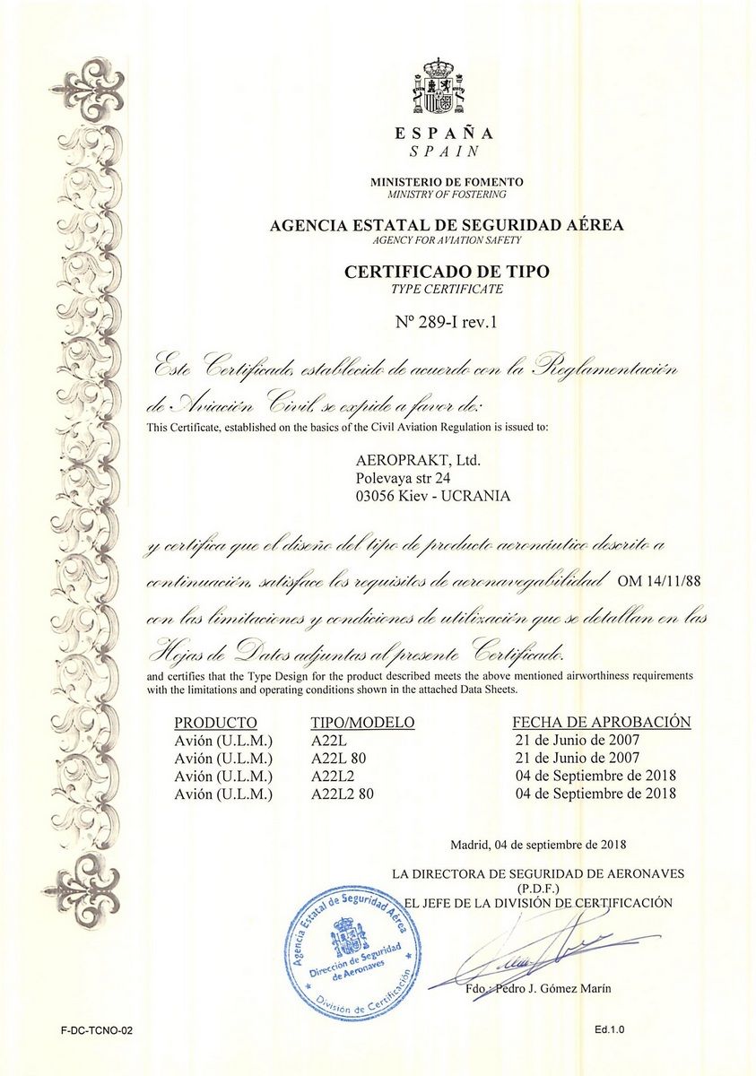 Получен очередной сертификат самолета А-22L2. 😎 На этот раз испанский. Мы около года работали над этим с испанской авиационной властью AESA и нашим дилером в этой стране.