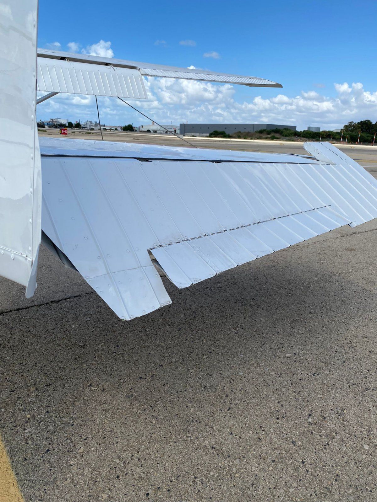 Самолёт привязан, руль опущен — он на замке ещё. А закрылки уже выпущены — готовлюсь к проверке. Сразу после этого пойду снимать замок и отвязывать скроет по мере осмотра.