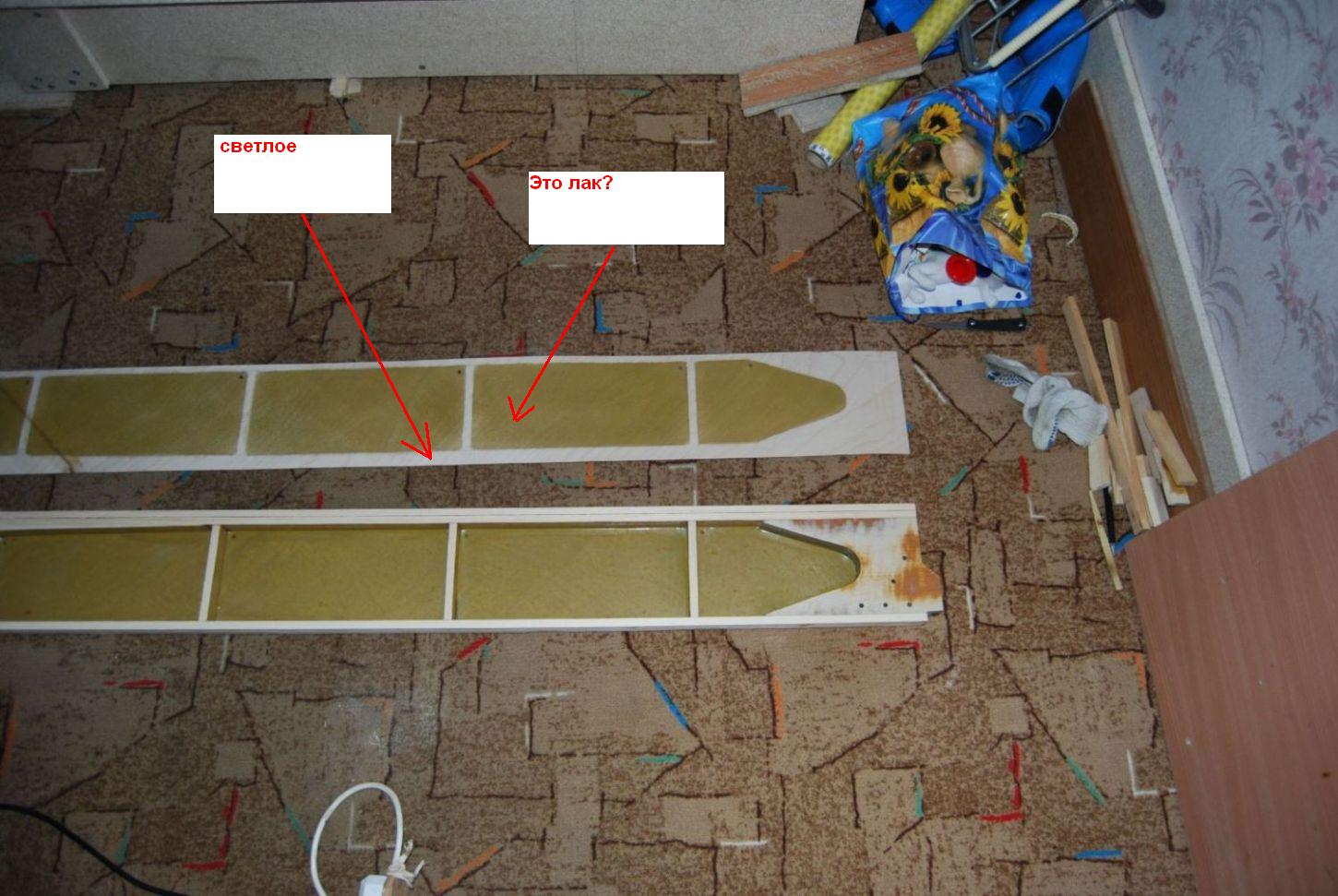 - Темные места - это на полосе фанеры, которая вторая стенка, и которая не приклеена еще к лонжерону и которая лежит параллельно лонерона, видны контуры полок и диафрагм цветом чистой фанеры, остальное чем то закрашено - типа лака, прозрачным, и цвет фанеры стал темнее. Что это?