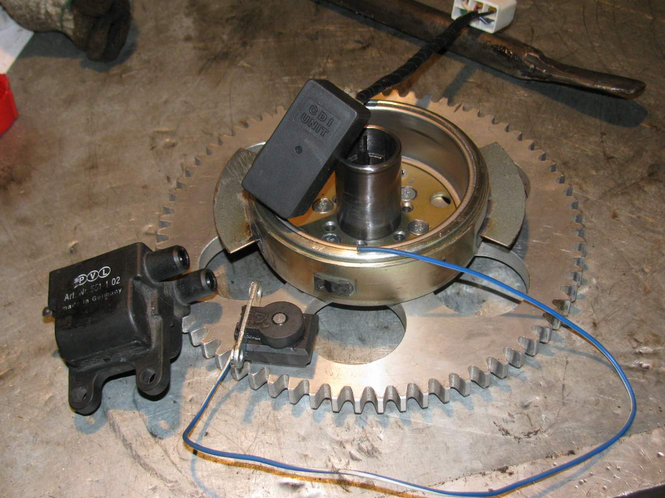 3. Как бы сделал я. Ротор накрыт шестернёй стартёра. И это очень удобно. Можно зажать между шестернёй и ротором шайбу из стали ( хотьбы из оцинковки 0,5 мм ) - внешним диаметром на несколько мм меньше выемок между зубами. Шайба нужна для устранения влияния отверстий в шестерне. По внешнему краю её можно приклепать к шестерне в точках между отверстиями ( ближе к внешнему краю ). Ну а к шайбе можно приклепать стальными потайными заклёпками - пару стальных квадратиков 15 х 15 х 5 мм... Это и будут магнитные замыкатели ( модуляторы ) для индукционных датчиков. Соответственно датчики нужно будет закрепить - керном к модуляторам.