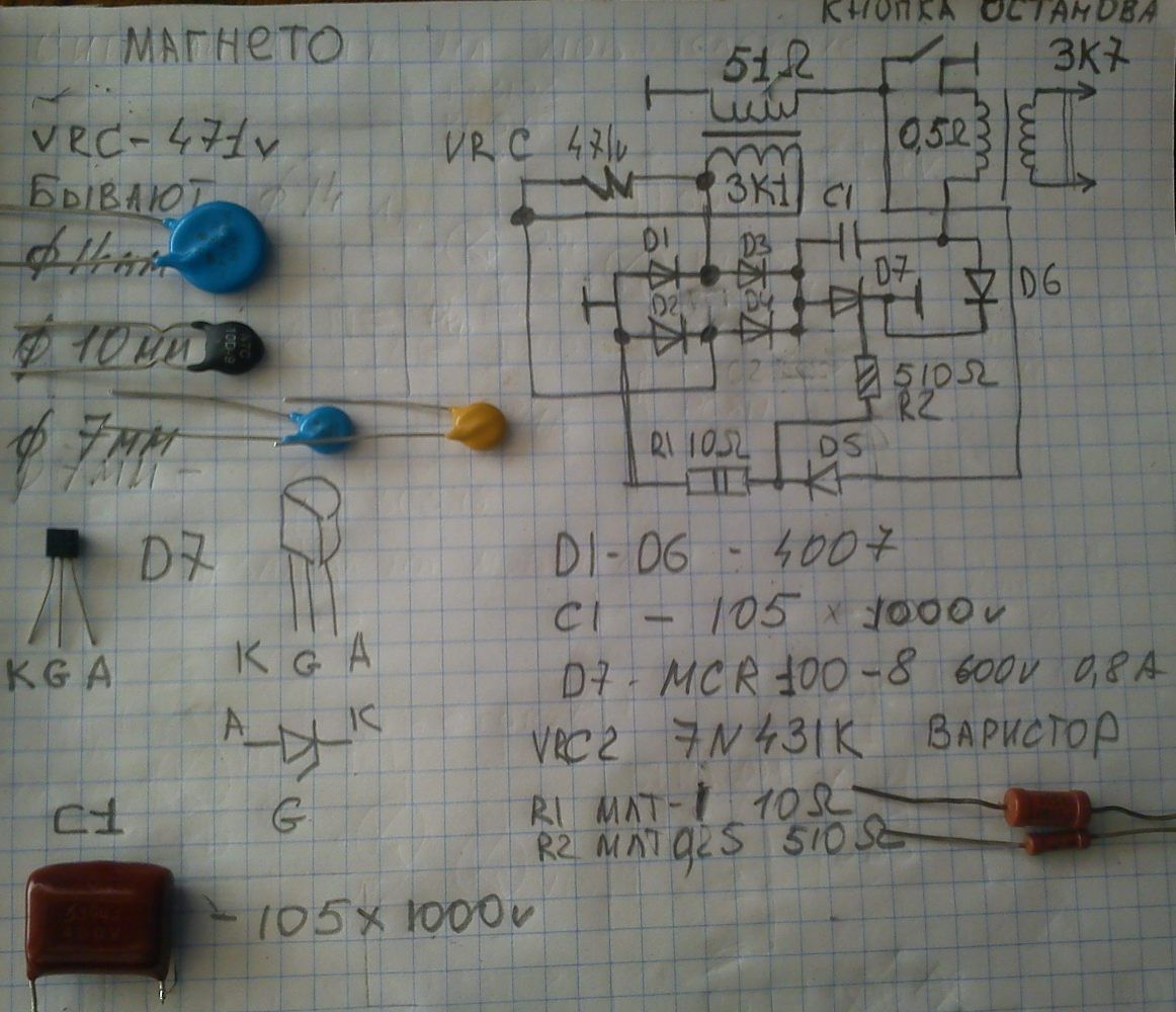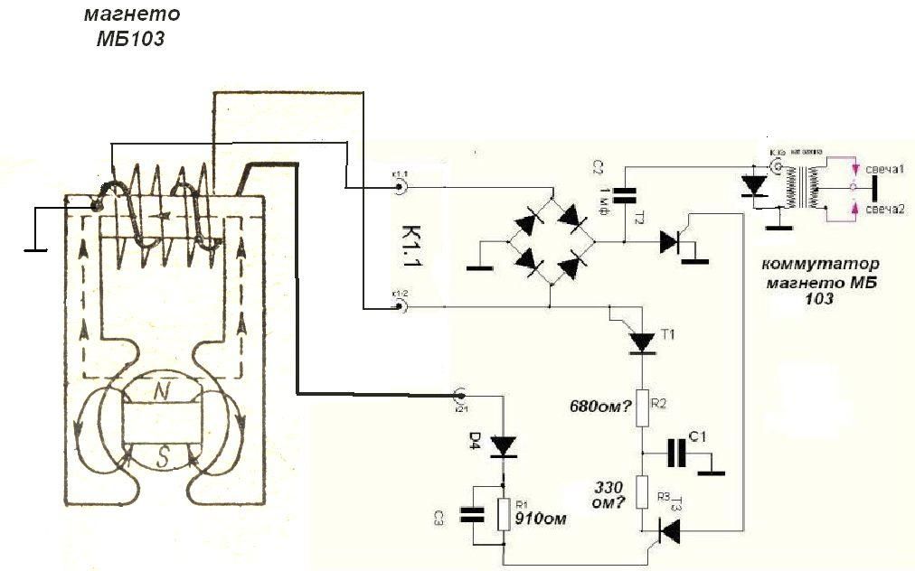 Имеет ли права на существование такая схема магнето МБ103, коммутатор, расковырен основательн, схема нарисована приблизительно, по остаткам элементов на плате, схема прилагается