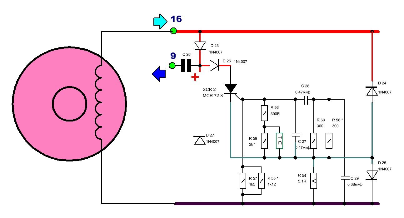 кондер на управляющем входе тиристора 22нФ х 25в, накопительный- 0.47...1мкФ (в разных коммутаторах разные попадались) х 250в;тиристор- 2Р4М, летит часто,т.к.работает почти на пределе