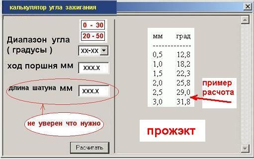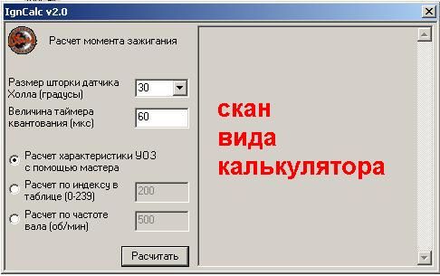 FlyCat  если  Вы  про  калькулятор  скан  вида  которого  я  выкладываю  -  вещь  на  мой  взгляд  бесполезная.  Рассчитан  только  для  рассчётов  под  систему  Сарумана.  На что   мне  угол  шторки  и  т.  п.  ерунда ?  Может  у  меня  контактное  зажигание  или  индукционный  датчик.  И  угол  задержки  будет  не  такой  как  у  сарумана ?  Думаю  что  нормальный  калькулятор  тоже  должен  существовать.  Хотя  Явисты  -  считают  в  экселе...  К  сожалению  я  экселем  пользоваться  не  умею.  Приходится  крутить  транспортир  -  что  не  есть  конечно  удобно....