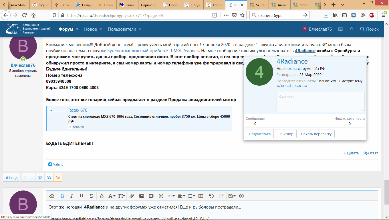 Внимание, мошенник!!! Добрый день всем! Прошу учесть мой горький опыт! 7 апреля 2020 г. в разделе "Покупка авиатехники и запчастей" мною была опубликована тема о покупке Куплю комплексный прибор Е-1 MGL Avionics. На мое сообщение откликнулся пользователь 4Radiance якобы с Оренбурга и предложил мне купить данны прибор, предоставив фото. Я этот прибор оплатил, с тех пор тишина в эфире. Более того, фото "своего" прибора я далее обнаружил просто в интернете, а сам номер карты и номер телефона уже фигурировал в сводках о мошенничестве. Сам виноват, сомнения были сразу.