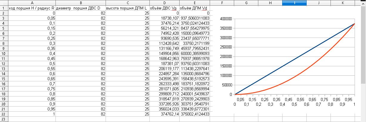 В "квадратной", 4-поршневой ДПМ текущий объём от хода поршня в общем случае также определяется формулой Vdpm = S * h, но тут наоборот, h- высота поршня, величина фиксированная, а площадь S, равна удвоенному квадрату радиуса описанной окружности R умноженному на корень квадратный из 2 -> S = 2 * R^2 * 2^0,5; Т.к. радиус описанной окружности это и есть рабочий ход, а все остальные величины в формуле константы, то зависимость изменения объёма от хода поршня в ДПМ квадратичная!