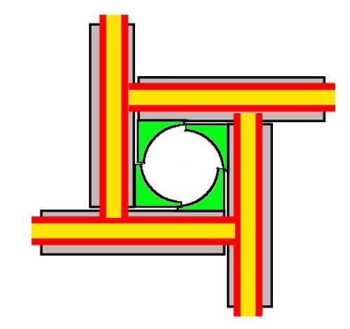 Ну, я предполагал в дальнейшем снабдить поршни "клыками"(на вложенном рисунке выделены зелёным цветом) так, чтобы закруглить углы в плане, можно вообще КС сделать цилиндрической. Правда больше из других соображений - чтобы избавиться от застойных зон в углах. Там будут скапливаться остаточные газы из-за плохой продуваемости этих мест, а значит вырастет температура в этих зонах, ухудшиться наполнение свежим зарядом и пр. Всё это, кстати, повышает риск детонации.