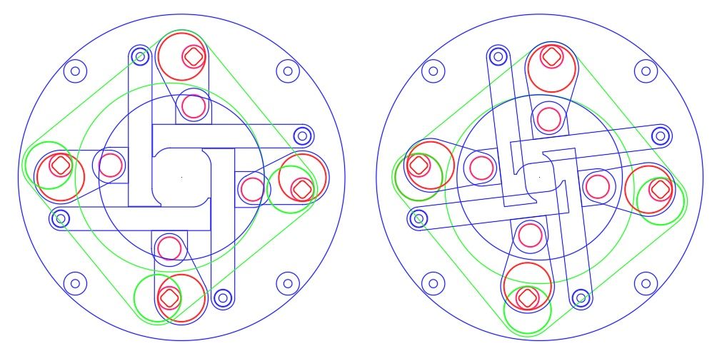 miharus, именно так я и хотел напечатать: зеленое дышло в одной плоскости, поршни с шатунами и дополнительными эксцентриками в другой плоскости. Развод эксцентриков обеспечивался бы квадратными в сечении валами с насадкой на валы эксцентриков и втулок-"подшипников". Но наглядно видно, что при ПРЯМЫХ поршнях, как у Автора в 19 ответе в этой темы, данная кинематика не проходит - поршни налезают друг на друга.