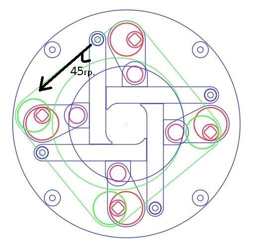 Меня вот посетила мысль. Вот в  этом положении нормаль давления газов будет перпендикулярна  проекции зелёных клыков, правильно? И далее по мере раздвижения поршней это должно сохраняться, т.к. поршень движется также под углом. Т.е. на этой части поршня нормаль совпадает с вектором перемещения поршня. ?????????