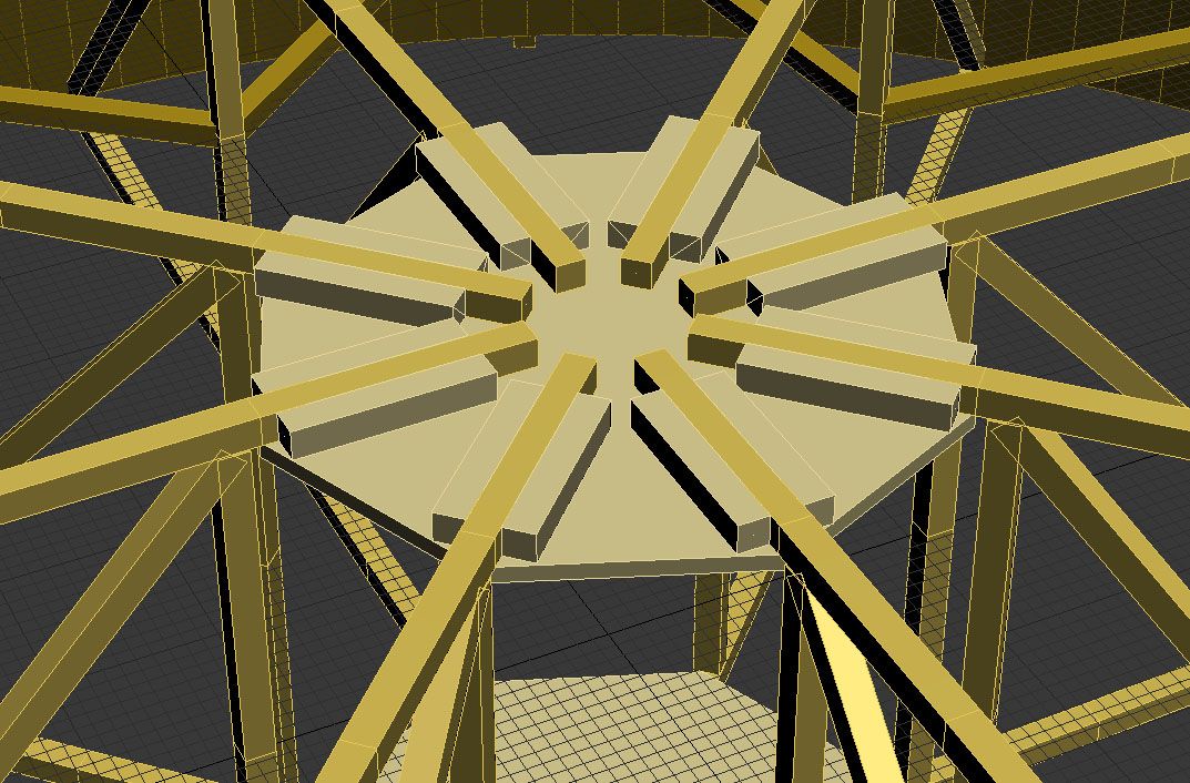 160кг / 10 пар нервюр = 16 кгЧто касается втулки - там по-моему вообще не важна образующая цилиндра, а важна заделка лучей в основания. Я бы сделал примерно так. Косынки не показаны.