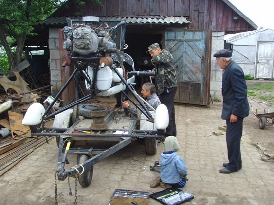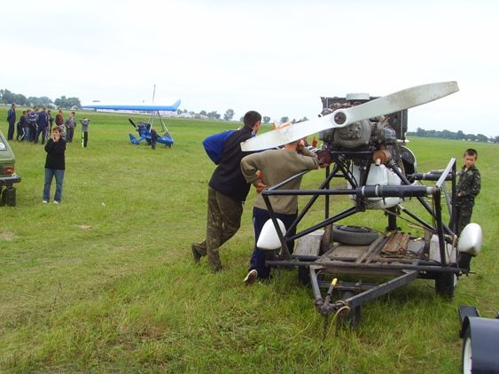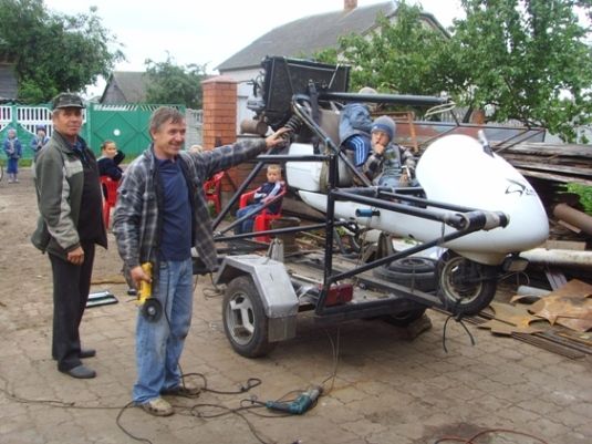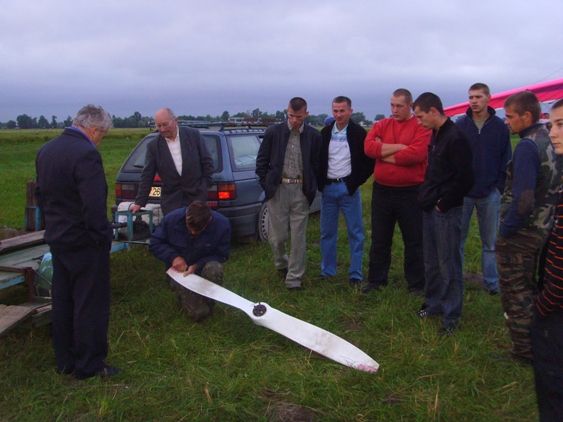Я уже хотел ехать домой, но посовещавшись мы решили что ремонт пустяковый и всё можно сделать. А ходивший среди местных кузнец-кулибин, Василь, вообще рассеял все сомнения . Мы зацепили прицеп с дельтой и поволокли в Ольшаны. Была найдена обычная водопроводная труба и с помощью балгарки, дрели и сварочного аппарата проведён ремонт . В это время, между полётами, Игорь отремонтировал мой винт.