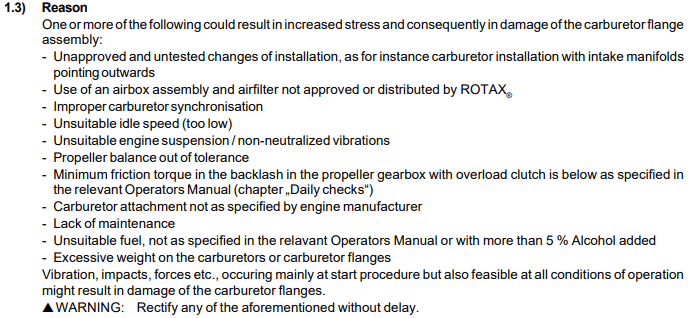 Даже если отрывает фланец полностью его ( карбюратор ) удерживает пружина, и двигатель остается рабочим. Только температура подростает.Аналогичную историю с разрывом хомутов карбюратора на 912 недавно тоже видел на одном самолете. Но там в полете из-за этого- отказ двигателя над лесом и благополучный спуск на МВЕН-ской спассистеме. Летчик игнорировал перебои в работе двигателя на малом газе при рулежке, а в полете патрубок с карбюратором совсем оторвался.