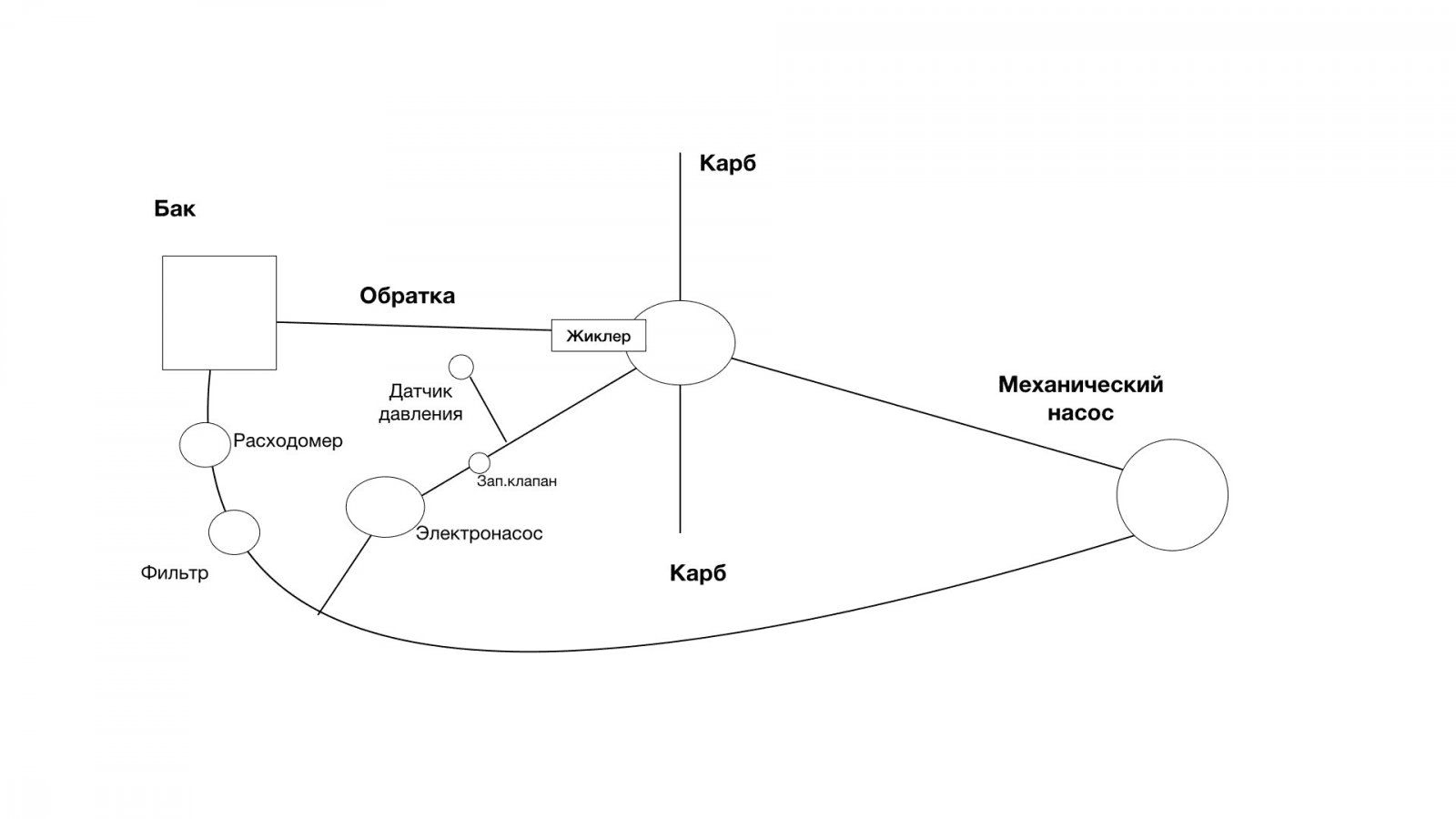 Согласно схеме обратный клапан расположен после всех насосов, но перед разветвителем на карбюраторы.