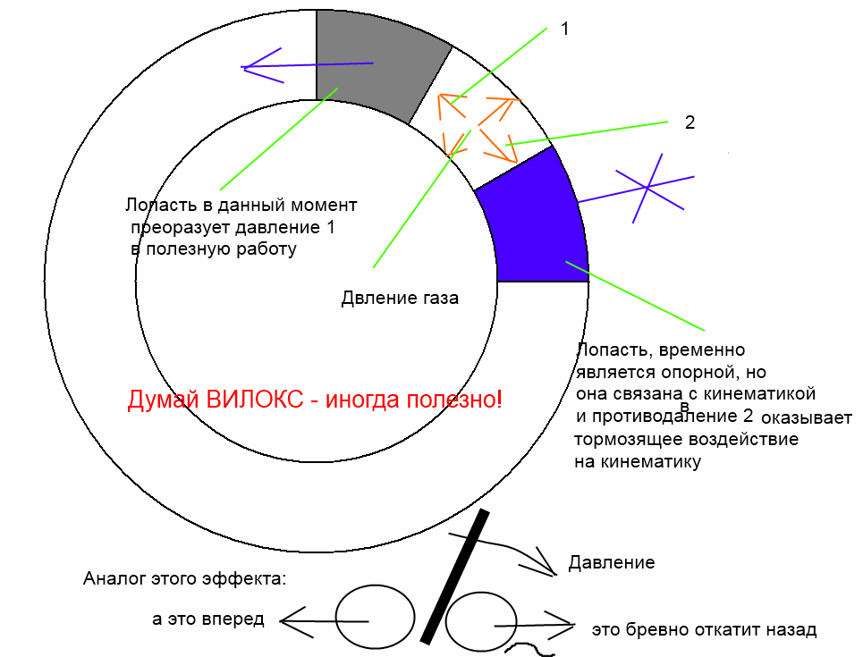 Вилоксу - полезная информация. Если не поймешь - тоже разжую: Ваша опорная лопатка(временно опорная) тоже кинематически связана с шестеренками и прочими механизмами, но и сюда проникают усилия противодействия, тормозящие общую передачу давления газа на полезную работу. То есть: ту лопатку , что газы должны сдвимнуть, газы давят и на противоположную лопатку, которая замедляясь догоняет, но газы её тормозят. Это уже потери(зависит от положения кривошипов). Причем = огромные кинетические потери. Намного больше, нежели в примитивном поршневом ДВС. Думаете Ё - мобильщики совсем идиоты? Денег у Прохорова дох...я, а даже модель = не работает!