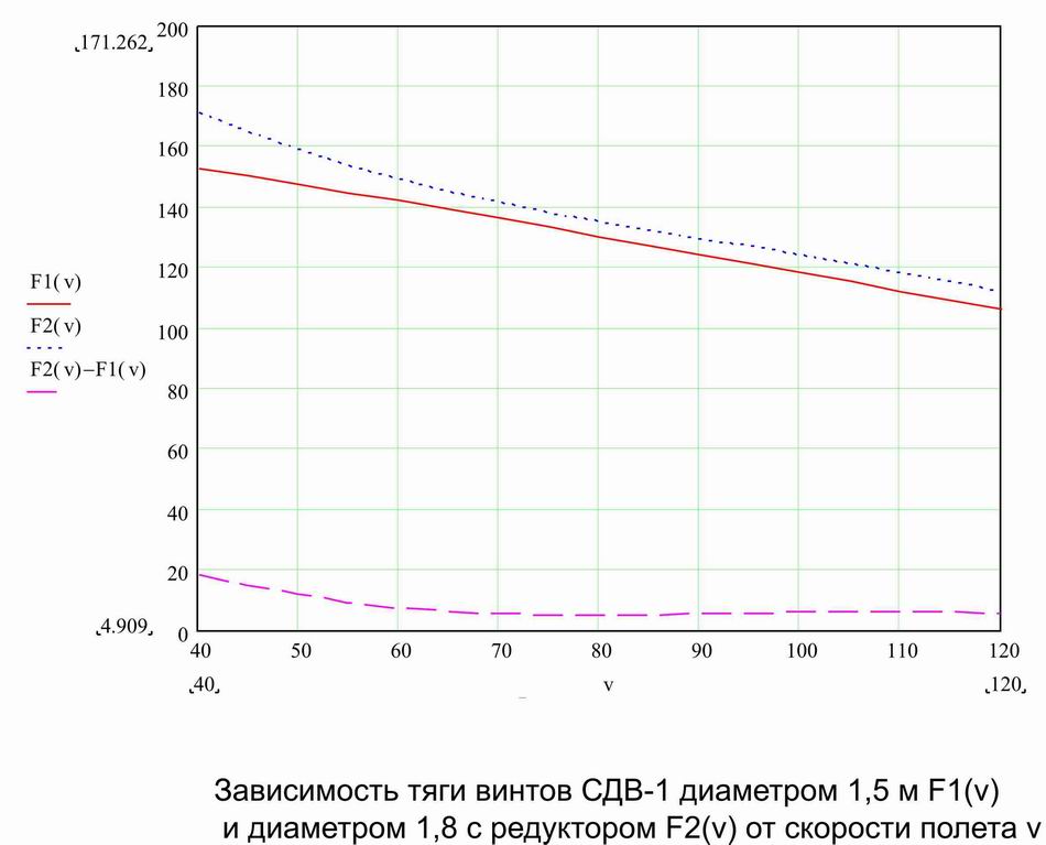 В своё время я посчитал разность тяги винтов 1,8 м с редуктором и 1,5 м без него на скорости. Прилагаю маткадовскую картинку. Из расчёта следует разница 8,5 кГ на 60 км/ч, 3,5 кГ на 80 км/ч и 0 кГ на 100 км/ч. Если бы это было так, то Стас не заметил бы разницы между нашим аппаратом и его. Видимо разница больше. Или причина в чём-то другом: другое крыло, другая скорость полёта. Может М.Розанов сдержанно пилотировал нашим аппаратом.  Дело не в этом. Разница есть и с этим нужно считаться. И принимать решение, насколько она важна в том или ином случае.