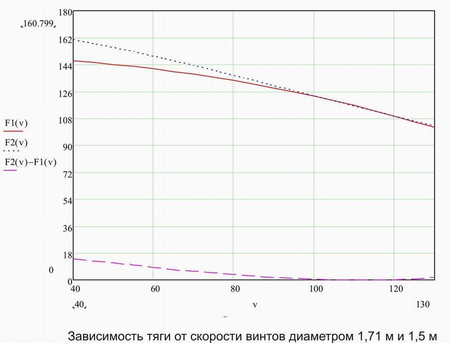 Графики, которые я привёл, не следует принимать, как истину в последней инстанции. И Стас задал резонный вопрос. Конечно же я брал два винта СДВ-1. Только большой с редуктором, а малый без него. У меня не было и не могло быть винтовых характеристик современных трёхлопастных пропеллеров для таких оценок. Но даже этих качественных (в математическом смысле) кривых достаточно, чтобы заподозрить более быстрое вырождение винтов большего диаметра. Тем более известно, что к.п.д. уменьшается с ростом количества лопастей. Вспомните однолопастные винты у моделистов. Вдобавок шаг трёхлопастного винта меньше, чем двухлопастного того же диаметра. Его вырождение ещё больше. Учёт к.п.д. редуктора даёт пересечение кривых на меньшей скорости (при 0,97 на скорости около 80 км/ч по графику).