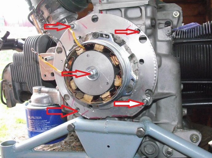 Треуется помощь - необходимы возможно более точные взаимные координаты (размеры) шпилек, отмеченных на фото стрелками, относительно оси коленчатого вала двигателя. Хочу смонтировать генератор типа Rotax.