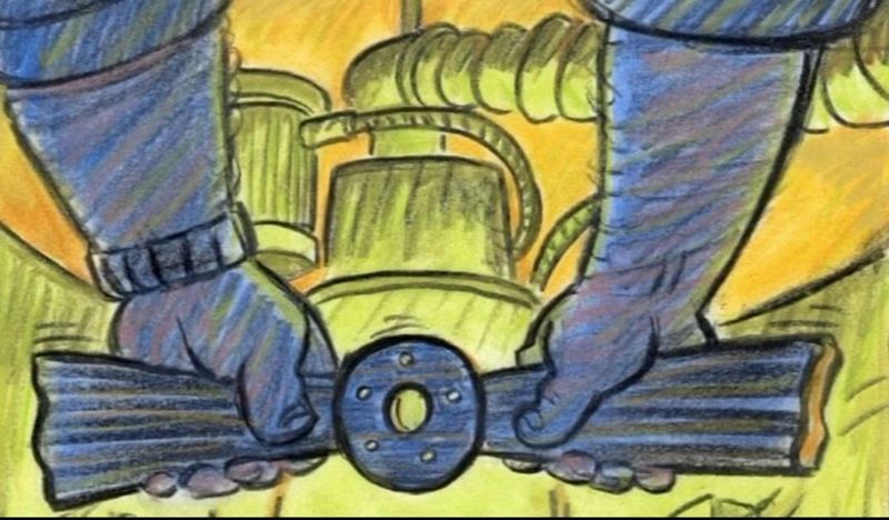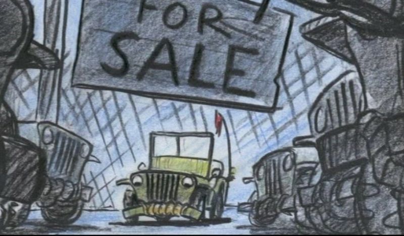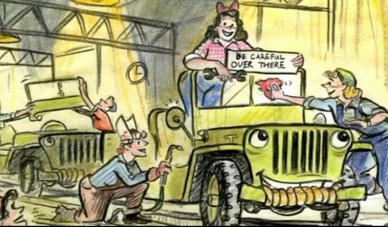 Сборка джипов. Только карандашная графика, подчёркивает эпоху сороковых.