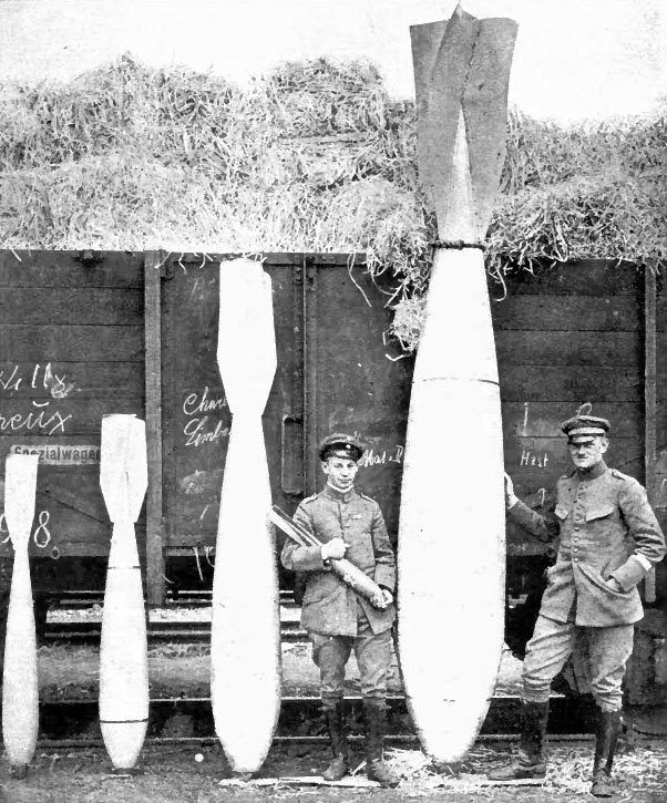 С воздушными бомбами дело обстояло также, как и самим летанием. Сначала их осмеивали, потом их замалчивали, затем стали отстаивать, а, в конце концов, относились как к чему-то само-собой понятному, и даже их прежние противники стали выдавать себя, где можно, за их авторов. Путь шел от бомбы в 3,5 кгр. весом к весу 1000 кгр. (60 пуд.) Это наибольший снаряд из всех орудий, который свет видел когда-нибудь до того, и будем надеяться, больше никогда не увидит. (такой снаряд был сброшен над противником в первый раз в ночь с 16 на 17 февраля 1918 года)