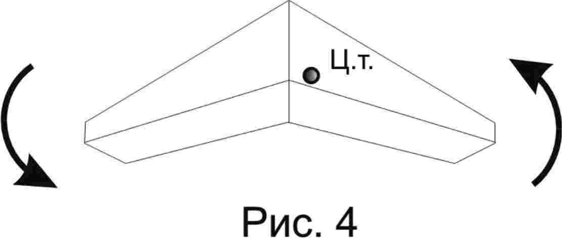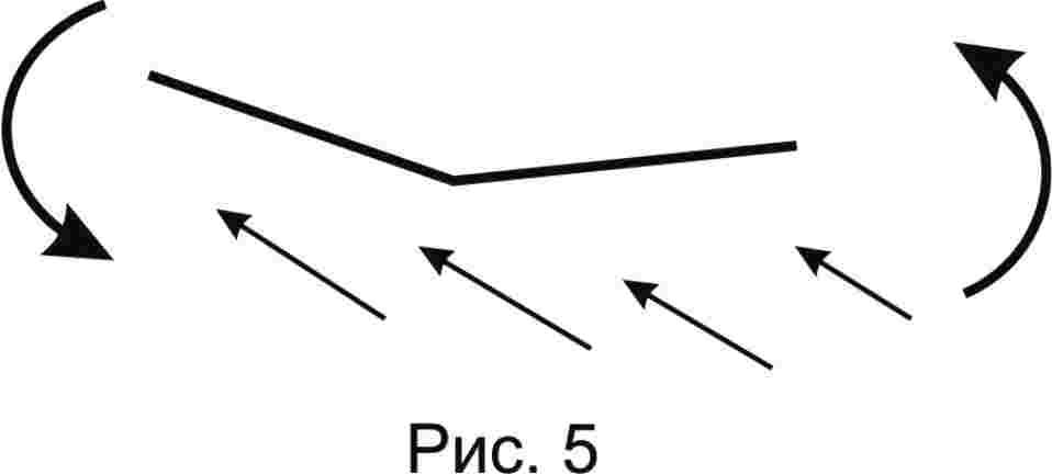 "Пусть наш дельтаплан имеет выраженное +V, т.е. его полукрылья приподняты относительно центроплана. Такой аппарат обладает устойчивостью по крену. При скольжении в бок, например, вправо он стремится поднять правое полукрыло (рис. 5). Попытаемся сделать правый крен и отклонимся вправо. Перегруженное правое полукрыло уйдёт вперёд и в скольжении поднимется. Угол атаки увеличится, а скорость уменьшится. Это задержит вход в правый крен. (Чтобы понять, почему увеличится угол атаки, можно вырезать из картонки стреловидное крыло и покрутить его в руках.) Но тут же появится момент, который повернёт аппарат вокруг вертикальной оси в сторону правого разворота. Этому способствует стреловидность дельтаплана. Таким образом, избыточная положительная V-образность затрудняет управление по крену. О таком аппарате говорят, что он «дубовый», или неповоротливый, как «утюг».