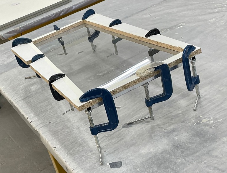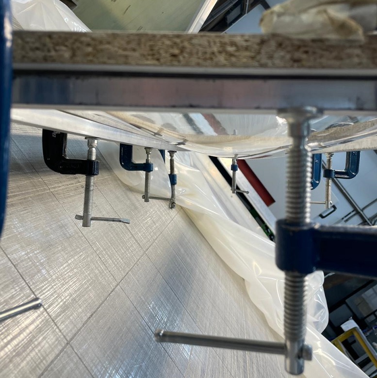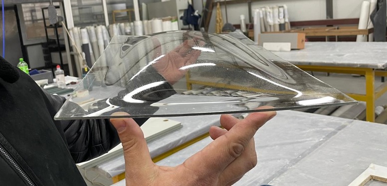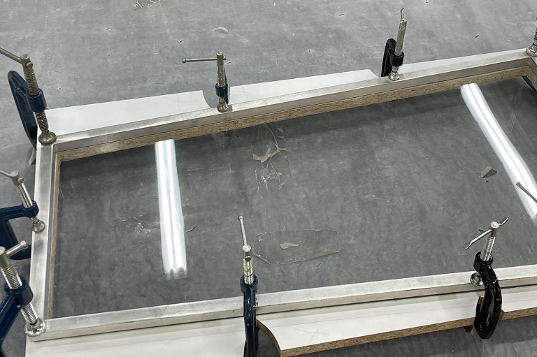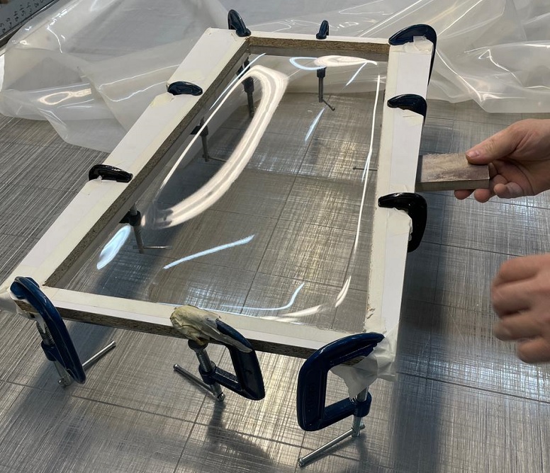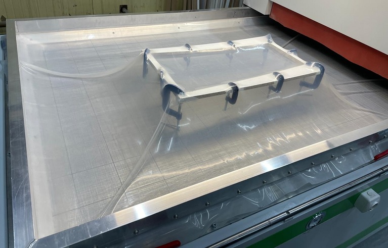 Процесс следующий: Оснастку со стеклом поместили в вакуумный пресс для изготовления мебельных фасадов, накрыли силиконовой мембраной, откачали воздух но не сильно, затем в течении одной минуты подогрели до 180 градусов, после размягчения поликарбоната дополнительно вакуумом поддавили до нужной формы. Остудили в течении нескольких минут и вынули.