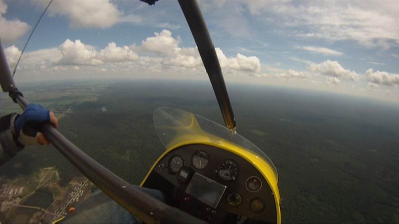 Меня закинуло на 1200 м; самолёт тужится - ищет термики. Не стал ждать, ушёл вперёд и ... мы потеряли друг друга впервые и единственный раз. Радиостанция села и почему-то не хотела заряжаться: неужели дождик испортил? Встретились через 2 часа 51 мин уже на площадке в Сузуне - небольшом городке среди шикарного соснового леса, где посадочной полосой служил небольшой стадион. И стали гвоздями местного праздника...