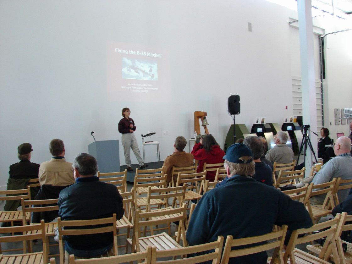 В ноябре прошлого года,музей провел нечто вроде семинара о самолете B-25. С докладом выступает Vera Martinovich летающая на B-25 принадлежещем музею. Всего, в США, две женщины пилотирующих B-25.