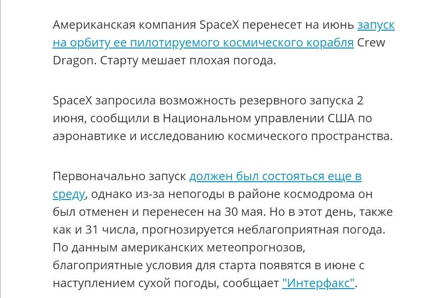 Отбой по погоде - это нормально. Не понимаю вашей эйфории. Роскосмос и в зной и в снег летает?Очередной перенос запуска , так что "закопателям" Роскосмоса и прочим либерал - предателям придётся подождать 🙁