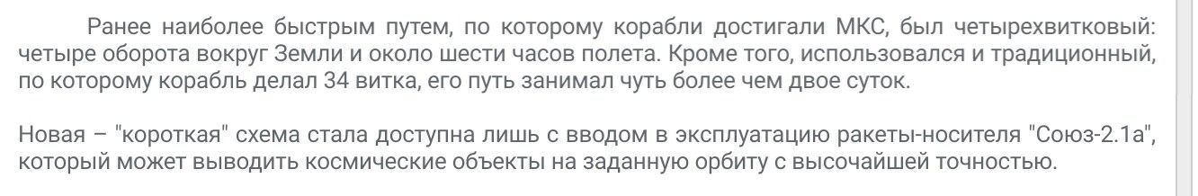 Смари-ка! А до этого, значит, экономией топлива не заморачивались? Фигали там, "полцентнера - туда, полцентнера - сюда!", так что-ли? А почему? Килограм вывода на орбиту стоит 10 тыщ зелени, т.е. наши тупо до этого просирали по 300 тон зелени в каждом полете, только из-за "странного" нежелания летать быстро? Серьезно?😁Быстрые схемы полета космических кораблей "Союз" позволяют экономить топливо и подготовиться к миссии на Луну, рассказал начальник отдела баллистики Ракетно-космической корпорации "Энергия" Рафаил Муртазин в трансляции на сайте "Роскосмоса"."По нашим прикидкам, двухвитковая схема по сравнению с двухсуточной даст нам порядка 30-35 килограмм экономии топлива. Это немало", - сказал он.Кроме того, по словам Муртазина, новая схема необходима для отработки технологий, которые потребуются во время лунных миссий, когда потребуется проведение быстрых стыковок в космосе. Эксперт назвал плюсы быстрых схем полета "Союзов" к МКС