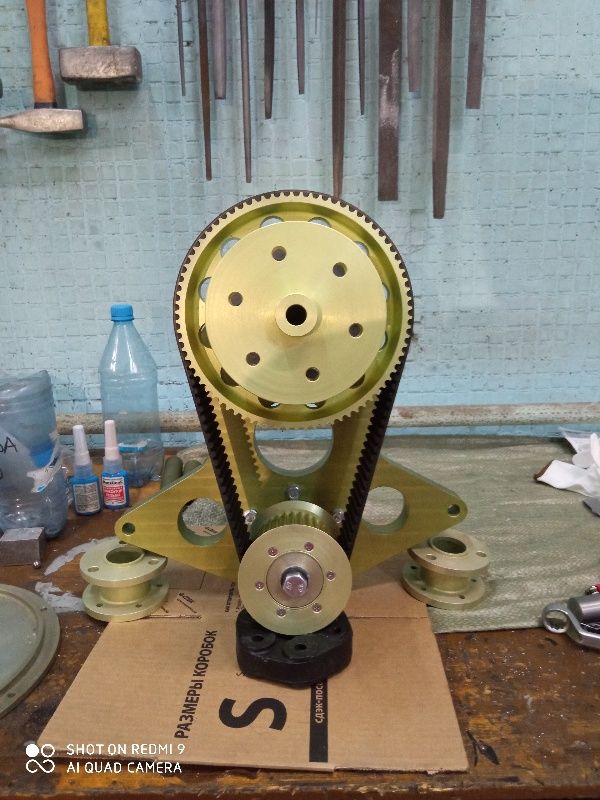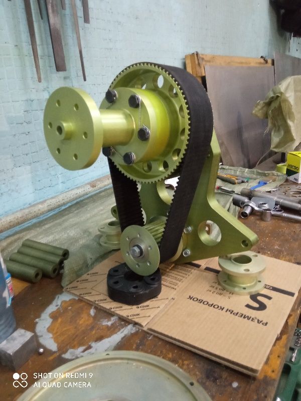 Редуктор на мощность до 130 лошадок. Передаточное 2,44 межосевое на ремне длиной 912мм будет 228мм, на ремне 880 мм межосевое 211мм. Полный вес редуктора с демпфером и всеми болтами 17 кг, сам редуктор 15,85кг. До этого редуктора весили около 16,5 кг, так что в принципе вполне нормально. Редукцию на этом редуктора можно делать разную меняя диаметры шкивов и длину ремня. Ступица винта тоже может изготавливаться разной длины.
