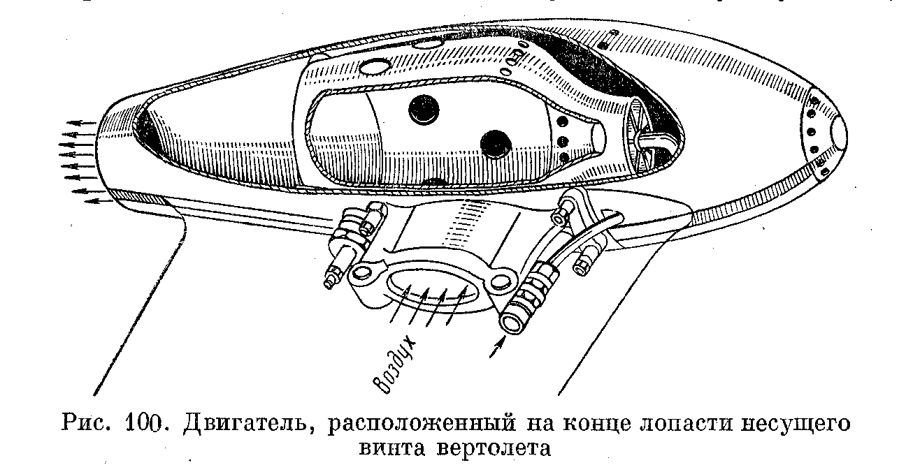Для чего это надо - организовать разнесенный турбореактивный двигатель; компрессор - лопасти винта, на концах лопастей камеры сгорания с дозвуковым(сверхзвуковым) соплом. Подача топлива(сжиженного пропана) осуществляется через втулку винта с помощью скользящего уплотнения, причем газ, прорывающийся через уплотнение попадает в воздушный канал лопасти и дожигается в камере сгорания.