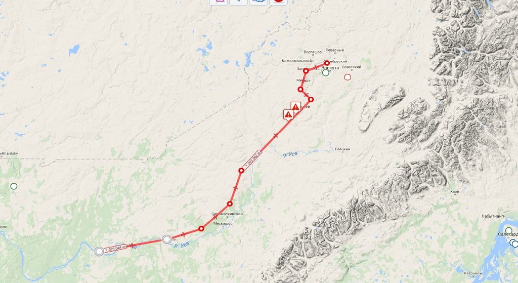 У поселка Адзьвавом, Уса рубит мой маршрут резким уходом на юго-восток, и 40 пустых километров разнообразят встречей с катером и баржой и авто выше всего. На всякий пожарный прошел ближе, но у парней все в ажуре, ловят рыбку.