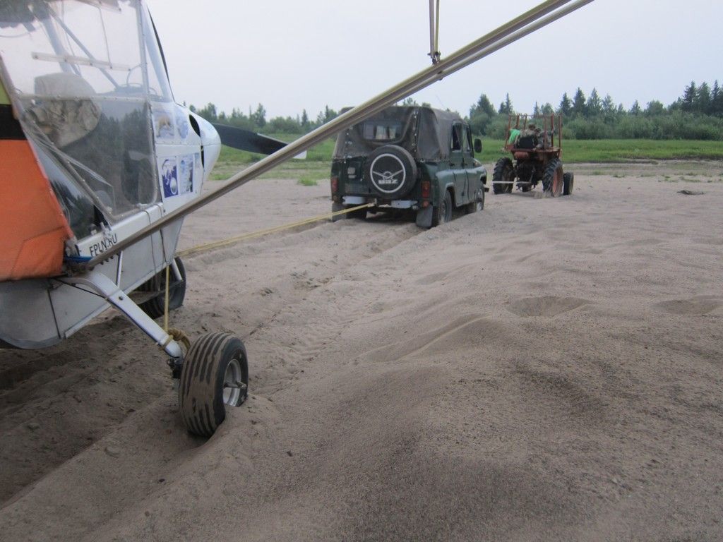 Еще и полчаса не прошло, а у меня рядом стояла старенькая Нива с дядь Гришей за рулем и парой прекрасных пацанят, его внуков. На этой Ниве, мы протащили самолет метров триста и Нива тоже стала копать в сухом песке.