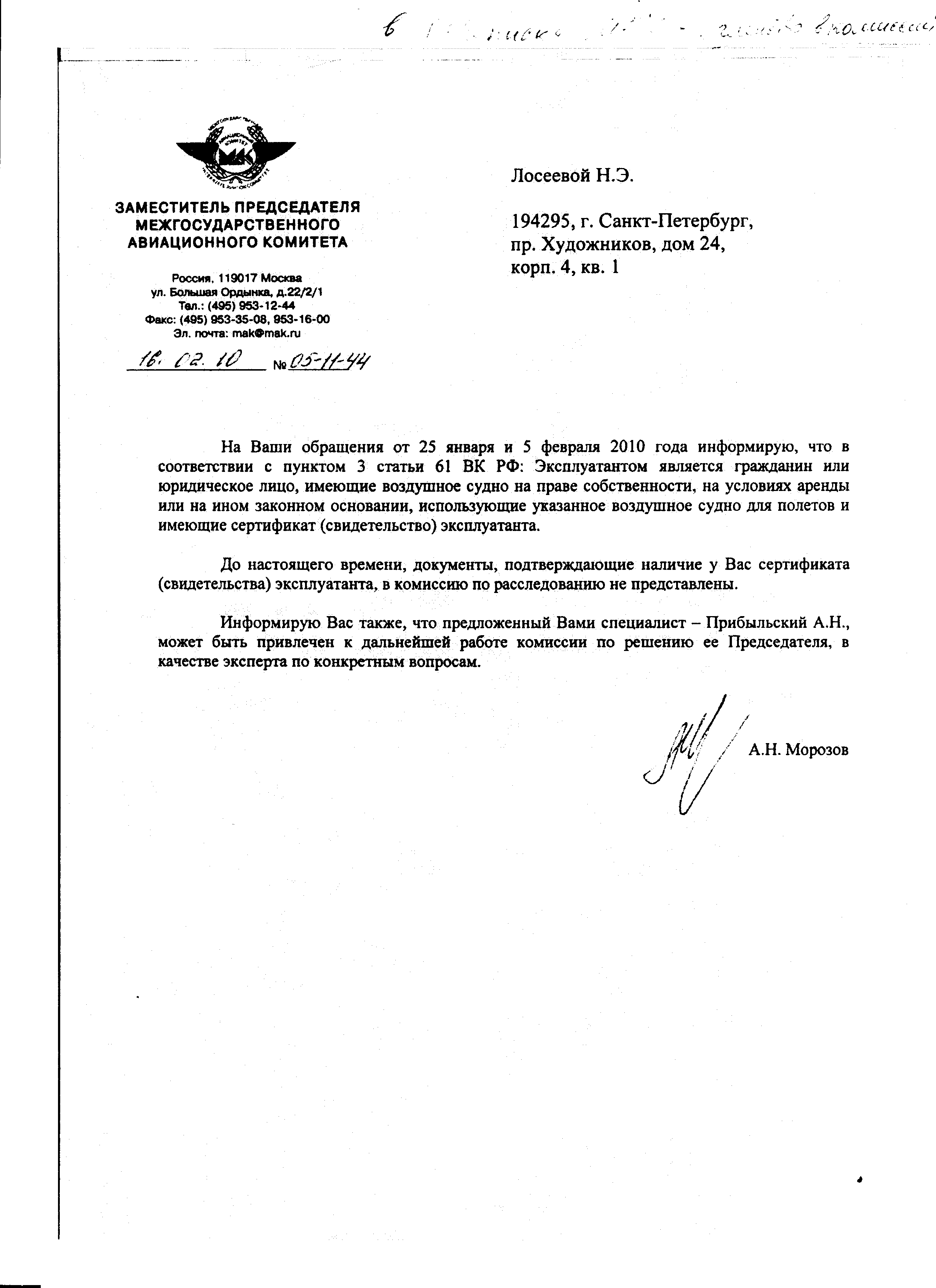 На мое компромиссное предложение о  включении в комиссию МАКа незаинтересованного  представителя эксплуатанта(Прибыльского А.) наконец-то пришел ответ.