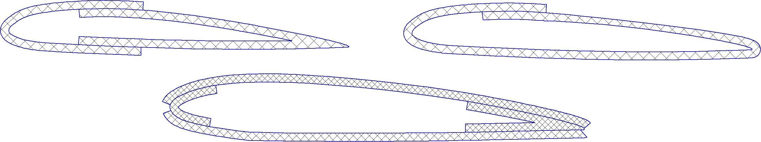 Варианты укладки ткани разные у всех. Мы использовали передний и задний пакет, у Финишпропа -общий пакет с перекрытием сверху при почти прямоугольной лопасти. Еще делают отдельно верхнюю и нижнюю поверхность в матрице и стыковочные пакеты по передней и задней кромке. Зависит от общей геометрии лопасти. См. рис.  Укладываешь пакеты в матрицу с зазором по краям, чтоб не защемило, мешок потом додавит. Внутрь пакета - мешок. И очень плавно поднимаешь давление. Все дело в нюансах, чтоб складки и непропрессованные пустоты не образовались. На переднюю и заднюю кромку на матрице прикатываешь ленточки, чтоб голой смолы не было на поверхности лопасти.