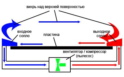 Если ВНИМАТЕЛЬНО глянуть на схему, то можно увидеть, что кроме "всасывающего" сопла, в ней присутствует и "дующее". Пластина притягивается к обоим. "Растягиваение" же возникает вследствии действия закона Бернулли: при увеличении скорости потока СТАТИЧЕСКОЕ давление в нём падает(вульгарная интерпретация). 🙂