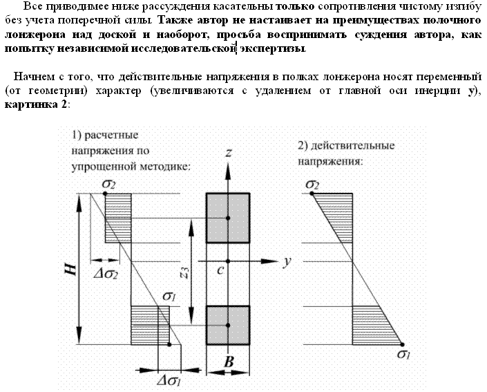 Действительно,приложив изгибающий момент к сплошному прямоугольному сечению,получите именно такое распределение напряжений как на ней нарисовано,дополнив лишь недостающими треуголничками до центра жесткости.Такое распределение соответствует вполне определенному деформированному состоянию,характеризующемуся тем,что прямые вертикальные линии,нарисованные на боковой поверхности лонжерона,при изгибе останутся прямыми - только теперь они перестанут быть параллельными,сходясь в сторону сжатых волокон.