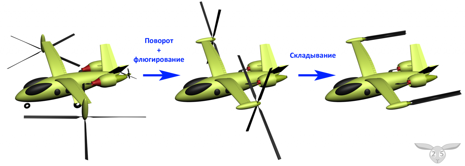 Оранжевый аппарат как раз не является конвертопланом в узком смысле. Я привёл его как альтернативу конвертоплану, которая на самом деле альтернативой не является: чуть бОльшие аппараты на том же принципе выглядят уже монструозно и летают ну так себе.