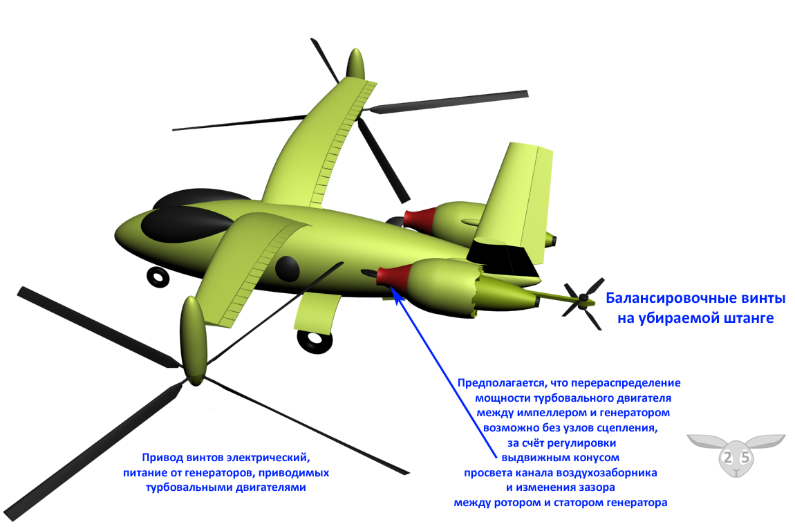 Тепловые двигатели не обязательно потребуются мощные. Вы проспали натриевые аккумуляторы с их высокими удельными мощностями.Если понадеется на электротягу, то это еще будет хуже за счет добавления мощного генератора и плюс вес электродвигателей с той же конской мощностью, большей чем у вертолетов.